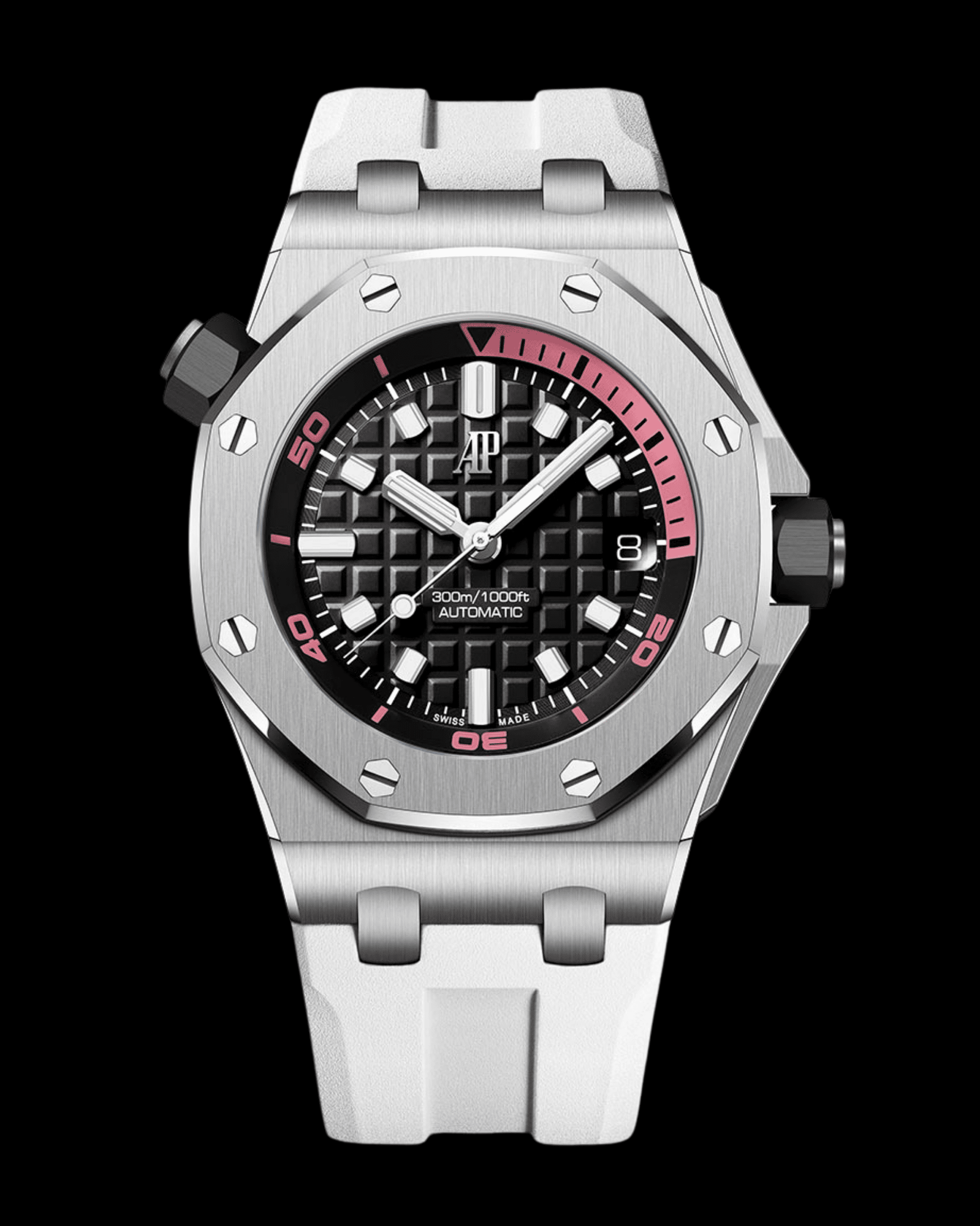The first model embraces contrast with a black dial punctuated by a vivid pink minute track. The effect is immediate and graphic, yet legibility remains uncompromised through white applied hour markers and hands that stand clearly against the textured surface. A second variation shifts toward a more fluid aesthetic, pairing a black dial with a striking turquoise tone that flows seamlessly from the inner bezel to the rubber strap, creating a unified field of color interrupted only by luminous indices and the AP signature at 12.