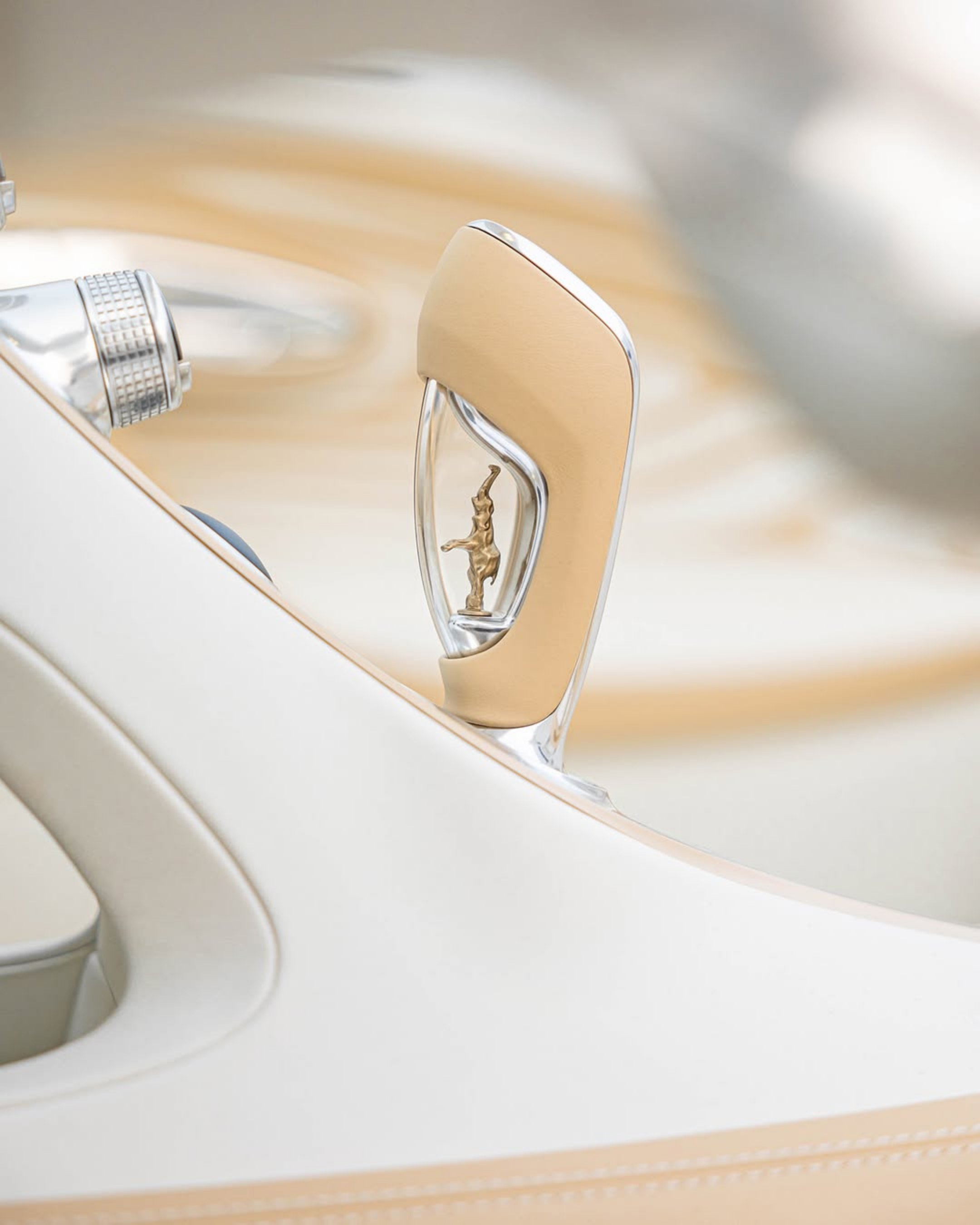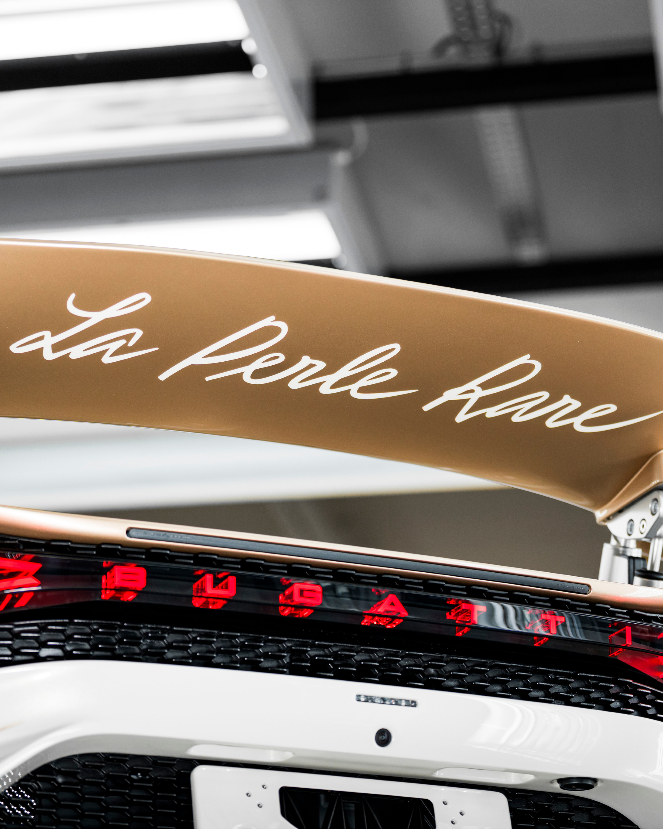 Inside, La Perle Rare maintains the concept without compromise. Every visible carbon component is painted white, extending the purity of the exterior theme into the cabin. The door panels carry alternating white and warm gold linework over their concave forms, while warm ambient lighting reinforces the pearl-inspired atmosphere. Machined and polished aluminum appears on the steering wheel accents, center console dials, and door handles, adding a crisp metallic counterpoint. The designation La Perle Rare appears throughout in Straub’s own handwriting – stitched along the central tunnel, engraved on the white-and-gold engine cover, and painted beneath the rear wing. Rembrandt Bugatti’s Dancing Elephant also features in the gear selector casing and on the body panels behind the front wheels, linking the commission to the marque’s heritage. Bugatti frames the project as a distilled interpretation of its Vagues de Lumière treatment, transformed here into a more focused study of reflection, contrast, and surface at the close of the W16 chapter.