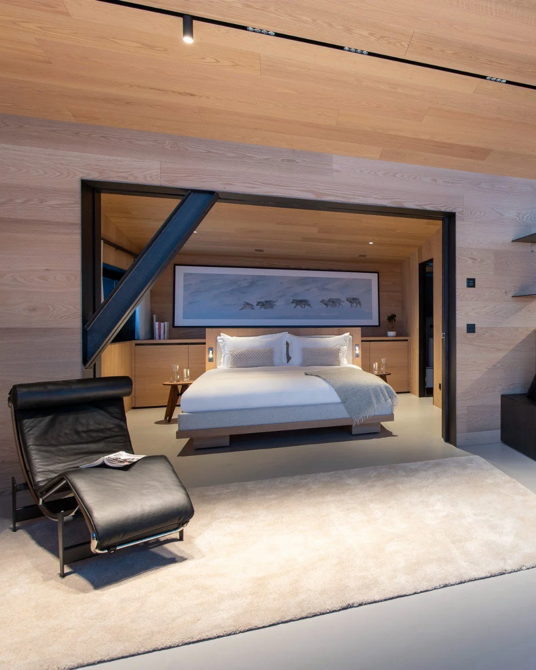 Inside, the 420m² layout is disciplined and intentional, centred around a single open living level where kitchen, dining, and lounge flow seamlessly into one continuous space. The dining table aligns directly with the window wall, framing uninterrupted views toward Mont Blanc as the central visual axis. A fireplace subtly divides the space without dominating it, while a sauna integrates naturally into daily routines rather than standing as a separate indulgence. Accommodation includes a master ensuite double, two additional doubles with a shared bathroom, and a pod-style dormitory beneath the eaves featuring enclosed sleeping pods for privacy. Capacity ranges from 6 to 12 guests, supported by a full staff including a private chef, ski guide, and house team, with full-board dining adapting between in-chalet meals, mountain restaurants, or curated picnic experiences depending on daily routes.