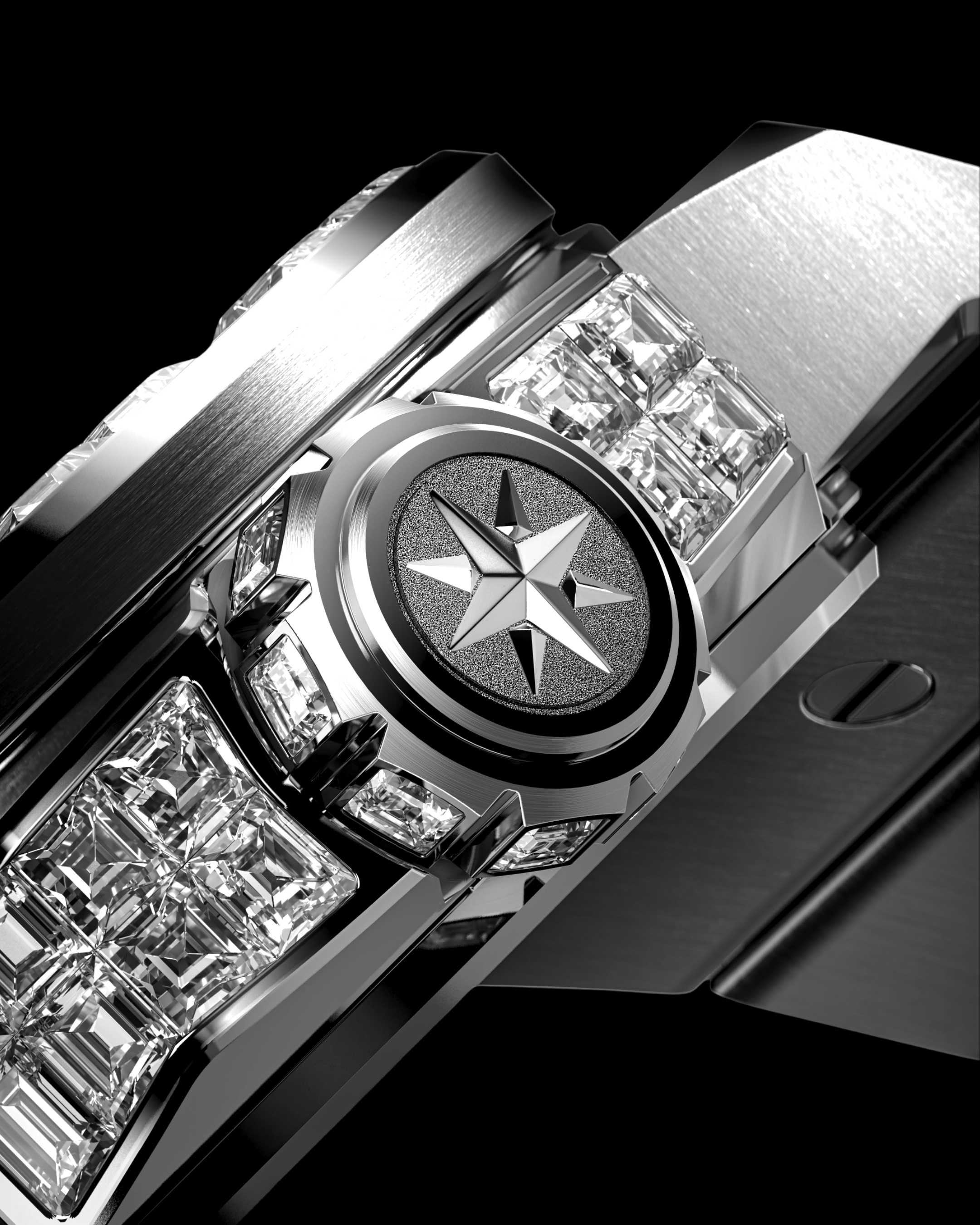 The execution is uncompromising – Ethical 18-carat white gold across the 41 mm case and integrated bracelet, with the dial, bezel, crown, and every visible surface set with diamonds. Total diamond weight is 29.02 ct. The dial is entirely paved with 18-carat white gold. Water resistance is rated at 30 meters, with sapphire glass up front and a see-through sapphire crystal case-back. The crown is screw-down, executed in matching ethical white gold.