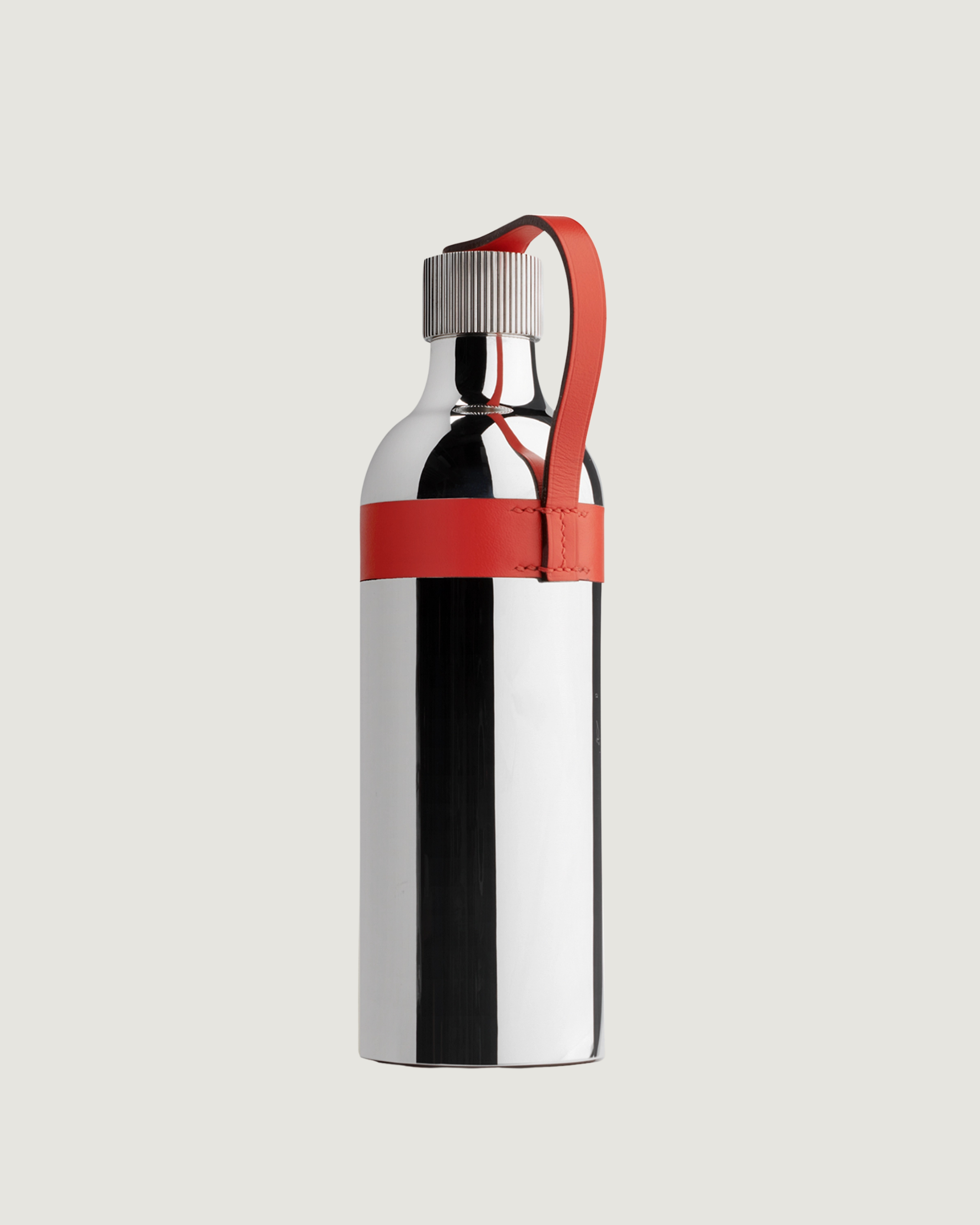 Function gives way to craftsmanship through subtle contrasts. A ribbed cap introduces structure, secured with a saddle stud detail that nods to the house’s equestrian heritage. Leather enters as a tactile counterpoint through a Taurillon strap, dense and textured, wrapping the flask with deliberate restraint. At its base, a stamped leather disc carries the Hermès Paris mark, anchoring identity without disrupting the object’s purity. Produced entirely in France, each component reflects the maison’s established codes in leatherwork and hardware, positioning the flask closer to collectible design than utilitarian accessory.