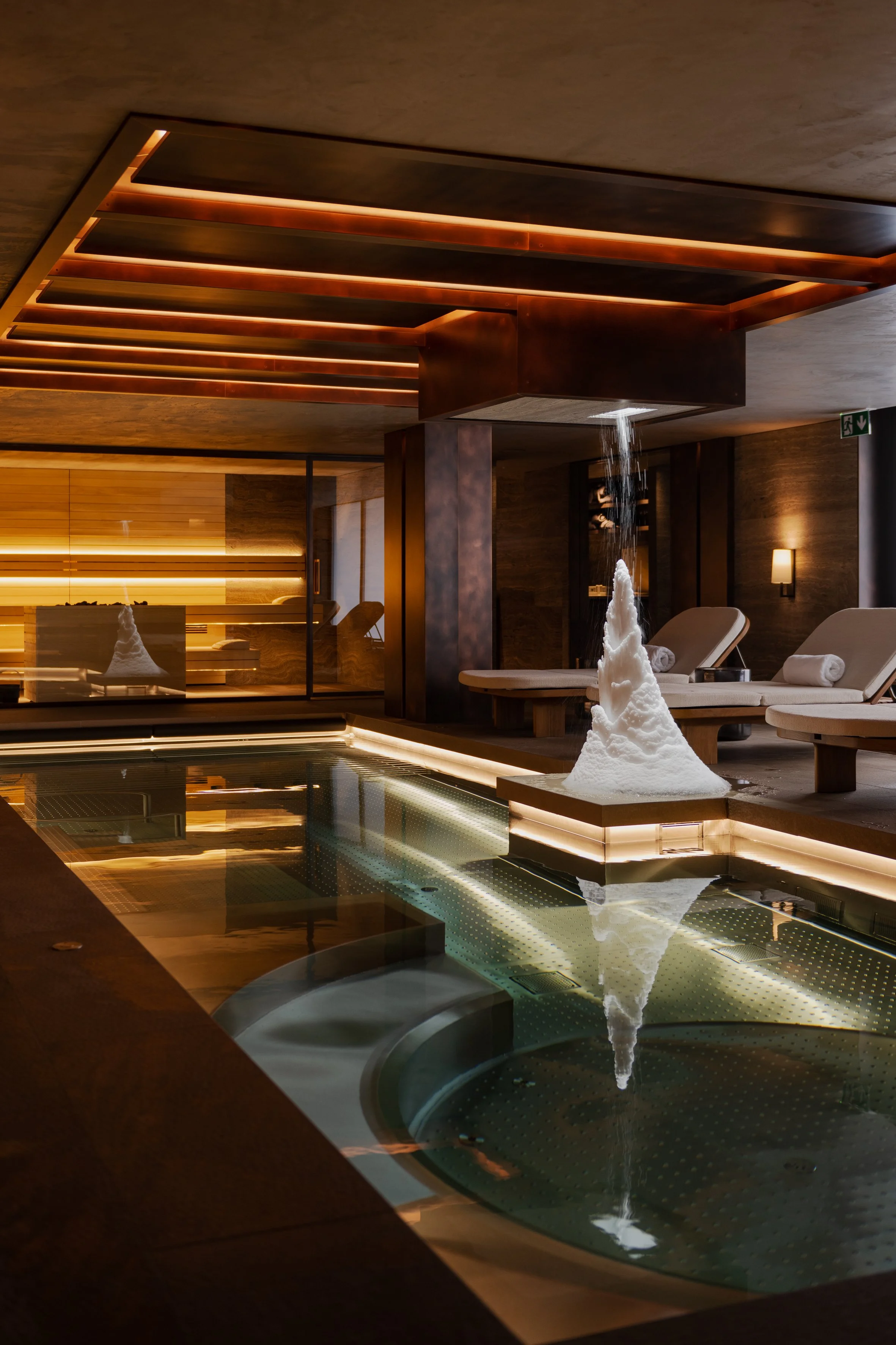 Indulge in an array of luxurious amenities, including a spacious living room with a fireplace, a state-of-the-art indoor pool, a hammam, a sauna, and an outdoor Jacuzzi. The large south-facing terrace, complete with a fire pit, offers stunning panoramic views of the surrounding mountains, providing the perfect setting for relaxation and contemplation. The amenities include: