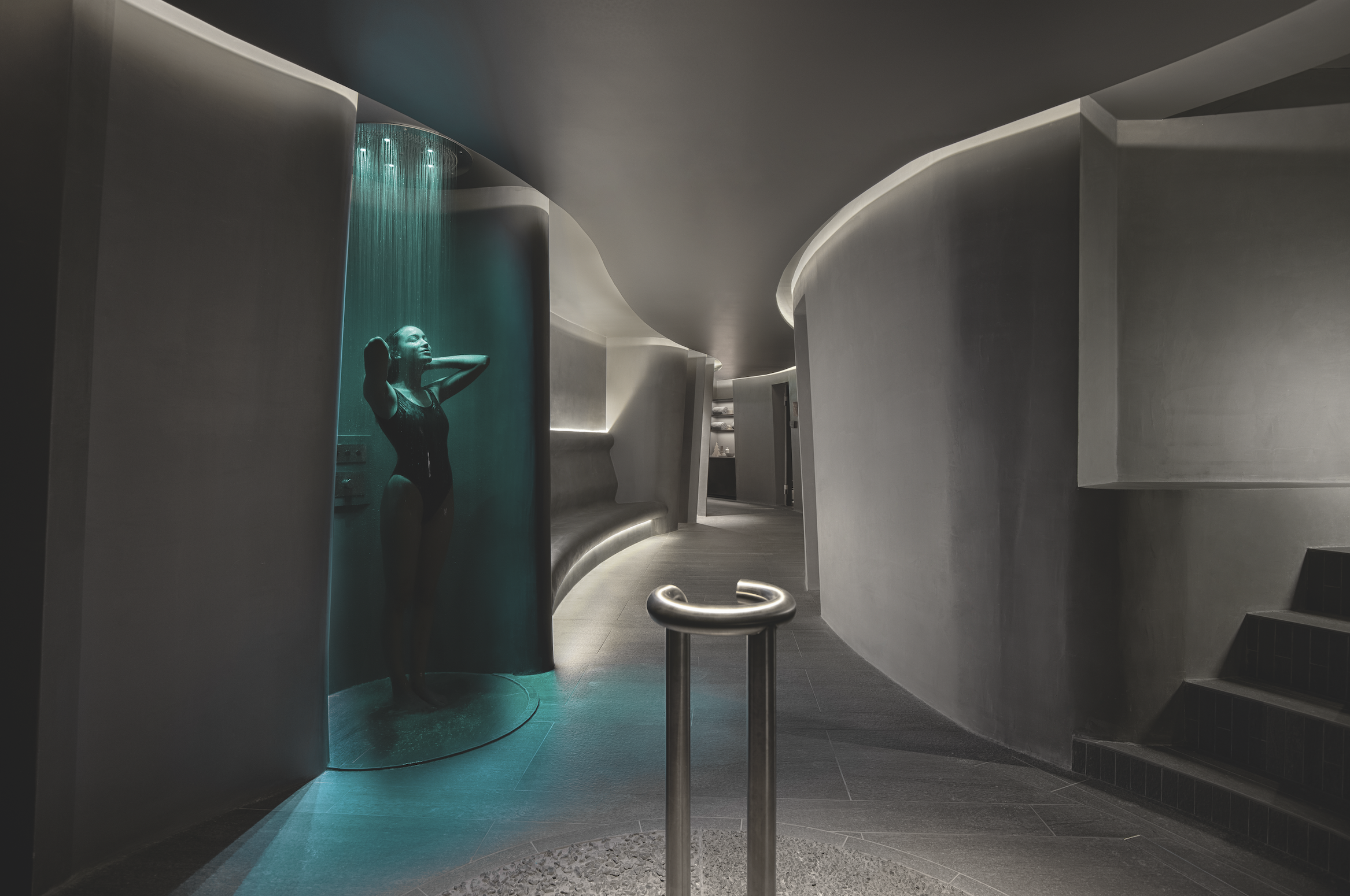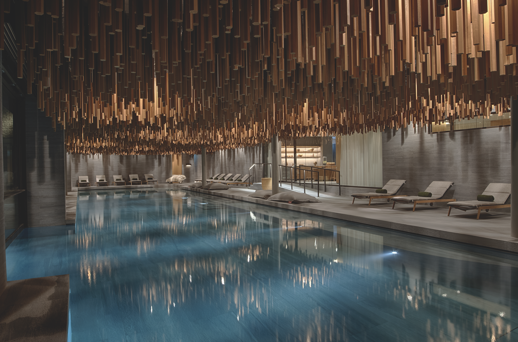 The extensive wellness facilities include a magnificent outdoor pool, a state-of-the-art spa, and wellness activities such as yoga, gym, and sound healing with crystal bowls. The spa features nine treatment rooms, a bio-hack recovery lounge, and various saunas, including Finnish, rock, and bio-salt saunas. Guests can enjoy an indoor pool that opens onto a courtyard with Birch trees, a rooftop swimming pool, and an Alpine garden. The spa also offers a unique Alchemy Bar where guests can create their own scrubs and shampoos using fresh, organic ingredients.