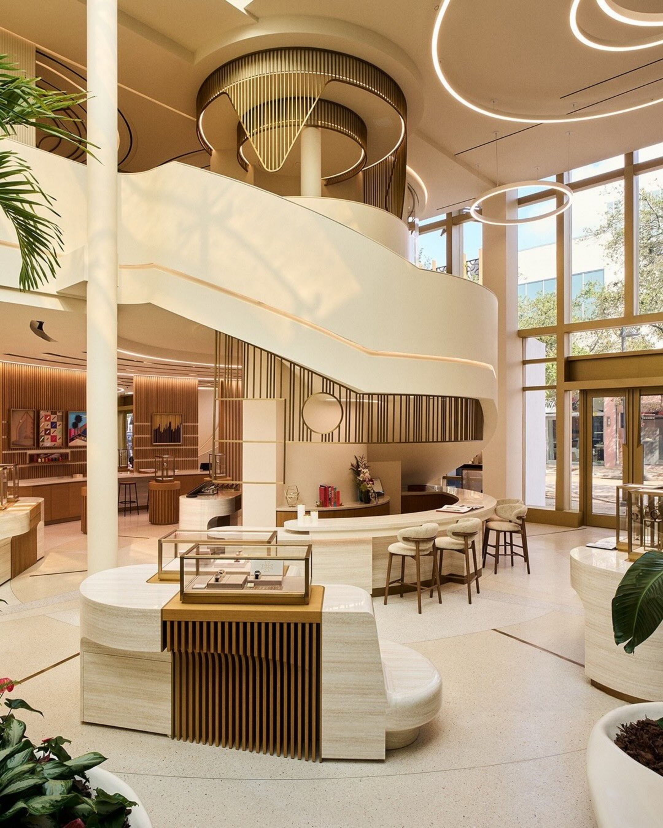 The second level introduces a more intimate dimension, accessed via a sculptural spiral staircase. Five distinct salons define the floor, each with its own material identity, from a white room with adjustable panels opening to daylight to a richly layered emerald-toned space with oak shelving and velvet seating. A circular bar beneath Art Deco lighting, enclosed in a gilded structure, anchors the social core. The opening attracted a tightly curated guest list including Tyson Beckford, Nacho Figueras, Lex Borrero, and Paul Boutros, underscoring the district’s emergence as a key node for watchmaking culture alongside recent moves by Christie’s. Designed internally following concept work that began in early 2024, the boutique reflects a deliberate emphasis on time spent within rather than transactional flow, redefining the luxury retail experience.